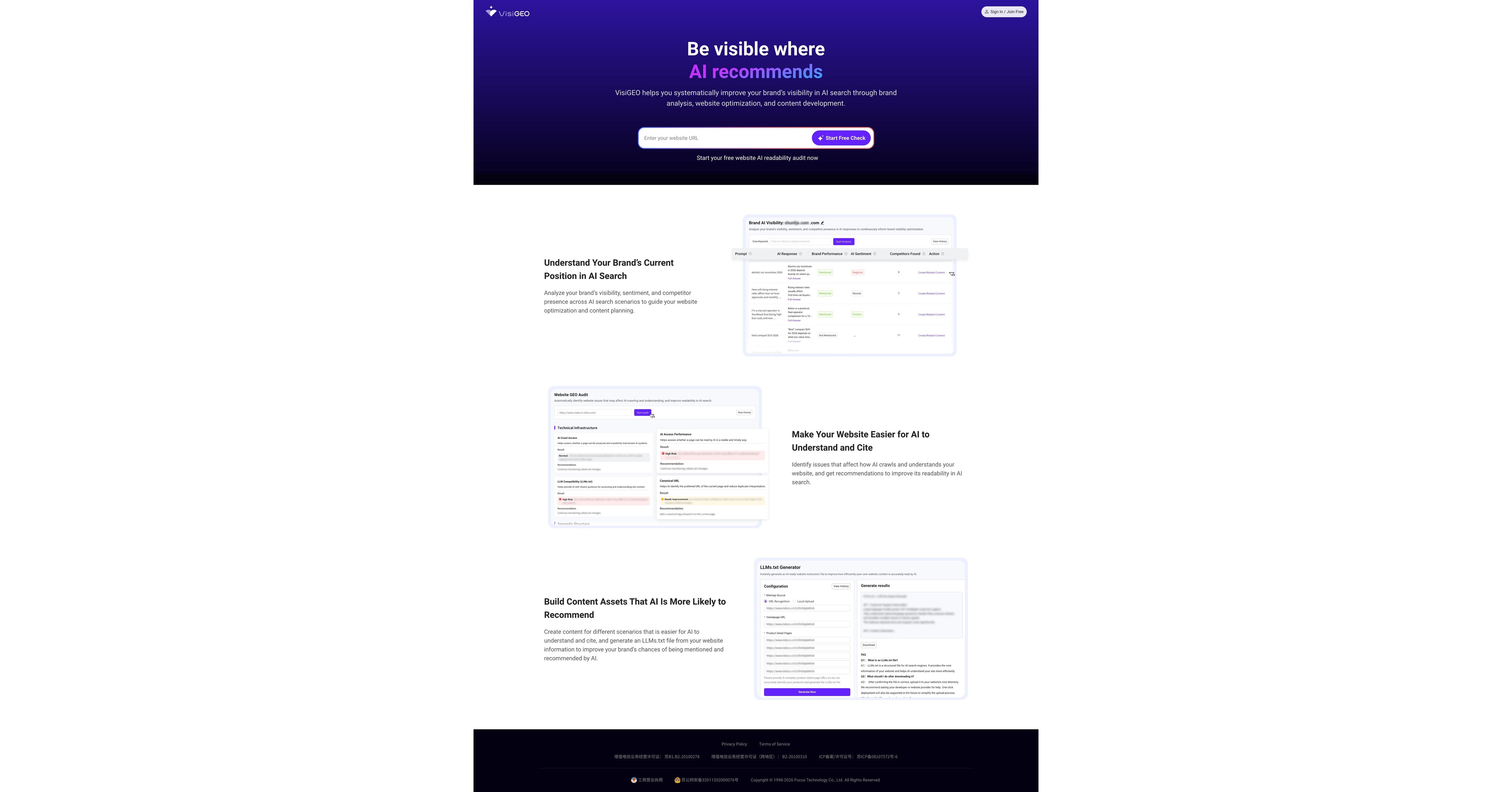 Focus Technology Co., Ltd. today announced VisiGEO, a Generative Engine Optimization (GEO) SaaS platform that helps brands ensure visibility in AI-driven answers like ChatGPT and Perplexity. The platform provides continuous AI Visibility Analysis, a Website GEO Audit including LLMs.txt generation and content creation, plus third-party publishing guidance to improve brand mentions, sentiment, and discoverability across major AI engines.